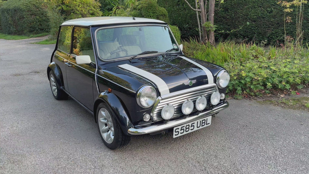 This Mini Cooper Sportspack was first registered on 22nd February 1999 and is presented in Anthracite grey with a white roof and body decals, over a Monaco beige and black leatherette interior. Features include Rallye-style fog and spot lamps, 13” alloy wheels, chrome interior trim, a burr walnut dash and a three-clock binnacle with magnolia-faced dials. Under the bonnet resides a 1275cc multi-point injection engine producing around 62bhp through a four-speed manual transmission.