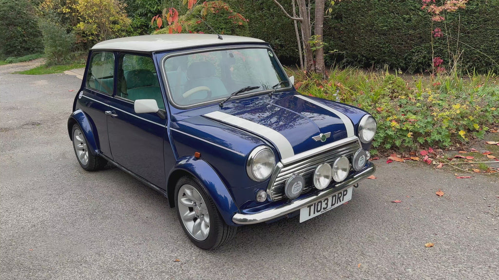 First registered by Henleys Rover of Northampton on 8th June 1999, this Mini Cooper Sportspack is finished in Tahiti Blue with a contrasting white roof and body decals, complemented by a Horizon Blue leather-trimmed interior. Features include Rallye-style fog and spot lamps, 13-inch alloy wheels, chrome interior trim, a burr walnut dash and a three-clock binnacle with magnolia-faced dials. Under the bonnet resides a 1275cc multi-point injection engine producing around 62bhp through a four-speed manual transmission.